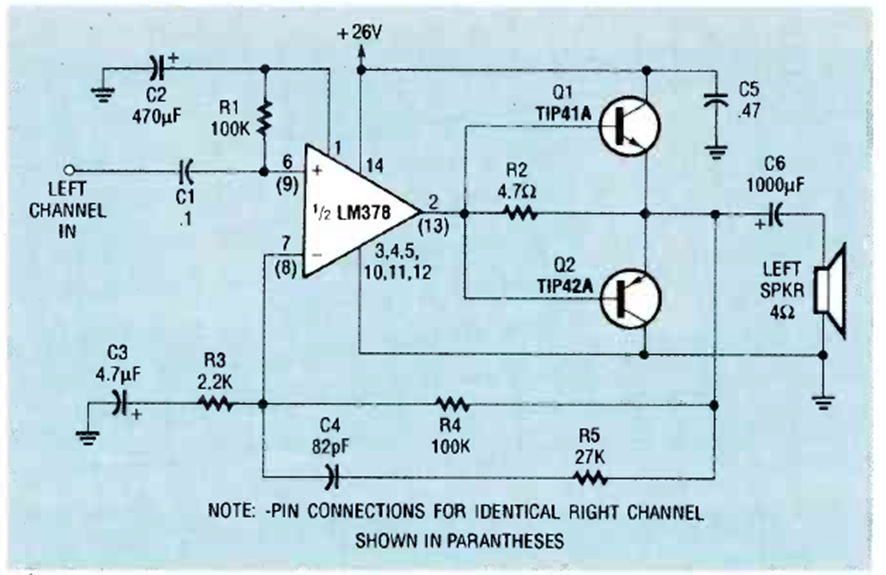 Este circuito proporciona 15 W por canal y puede funcionar con una sola fuente. El circuito es de una Radio Electronics de abril de 1990.