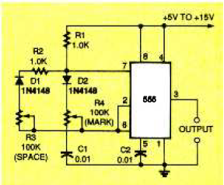 Este circuito sintonizado por ancho de pulso se encontró en la revista Electronics Now de marzo de 1996. La frecuencia base depende de R1 y C1.
