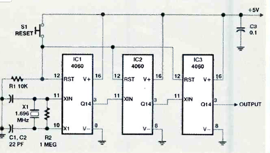 Este circuito extremadamente lento produce un pulso por mes y se puede utilizar en un temporizador. Lo encontramos en la revista Electronics Now de noviembre de 1998.