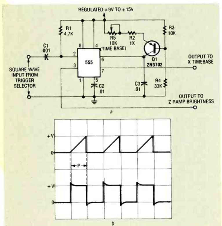 Este circuito que genera una señal de diente de sierra lineal se puede utilizar en un osciloscopio de rango de frecuencia. El circuito fue encontrado en la edición de diciembre de 1992 de la revista Radio Electronics.