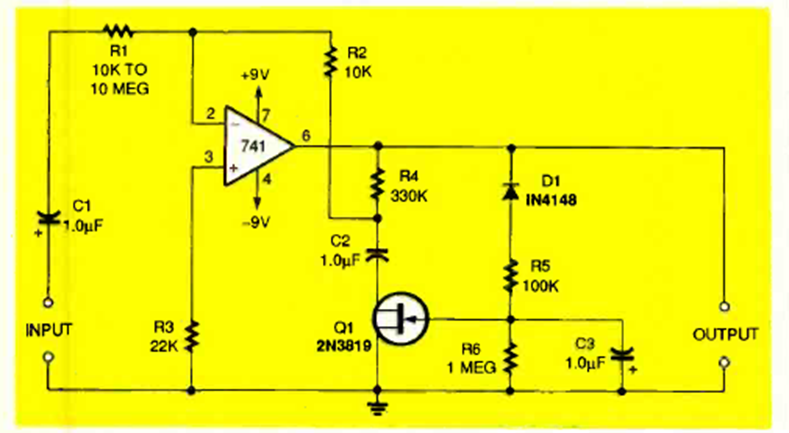 Este circuito fue encontrado en la revista Electronics Now de marzo de 1995. El circuito requiere una fuente simétrica y el FET es un tipo común de propósito general.