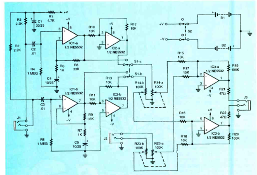 Este circuito fue encontrado en la edición de septiembre de 1997 de la revista Electronics Now. El circuito es para auriculares de baja impedancia alimentados por dos baterías.