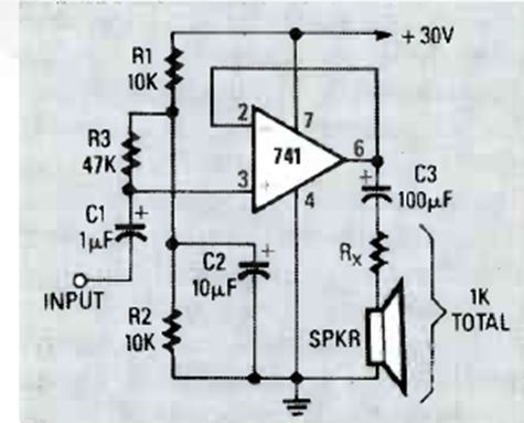 Este circuito de unas pocas decenas de miliwatts de potencia requiere una fuente simple. Lo encontramos en una Radio Electrónica de marzo de 1990.
