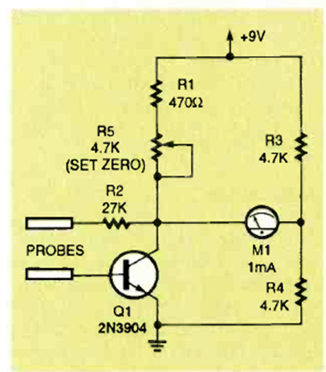 El instrumento detecta pequeñas variaciones en la resistencia de la piel de la persona que sostiene los cables de prueba. El circuito es de una revista Electronics Now de mayo de 1994.