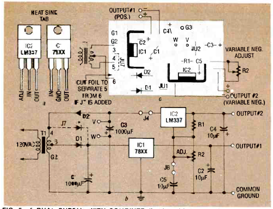 Esta fuente de alimentación de doble sintonización se encontró en la edición de junio de 1990 de la revista Radio Electronics. Los circuitos integrados deben estar equipados con disipadores de calor. La fuente proporciona dos tensiones.