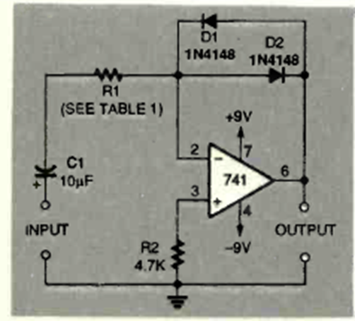 Este circuito con el amplificador operacional 741 fue encontrado en la edición de marzo de 1995 de la revista Electronics Now. El circuito requiere una fuente de alimentación simétrica.