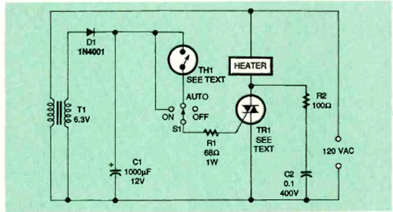 Este circuito triac se encontró en la revista Electronics Now de julio de 1995. El Triac está en función de la corriente del elemento calefactor y debe estar equipado con un radiador de calor.