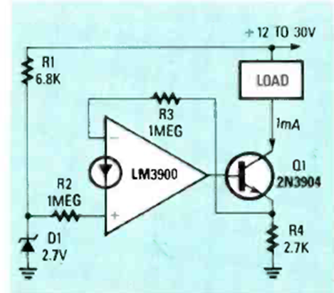 Este circuito utiliza un amplificador Norton LM3900 y un diodo Zener de 2,7 V para suministrar una corriente de 1 mA a una carga. El LM3900 es un amplificador Norton.