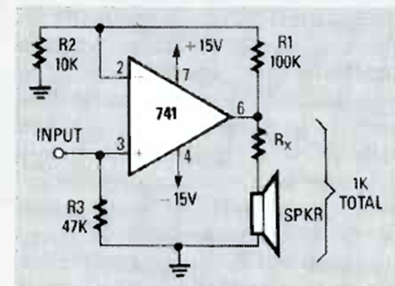 El circuito que se muestra a continuación se encontró en la edición de marzo de 1990 de la revista Radio Electronics. El circuito requiere una fuente simétrica y su potencia es del orden de unas pocas decenas de miliwatts.