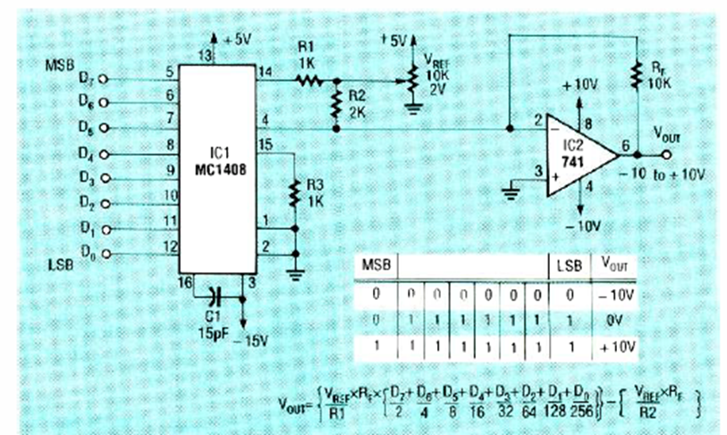 Este circuito convertidor de señal digital a analógica se encontró en la revista Radio Electronics de julio de 1991. El circuito convierte la corriente de salida en tensión.