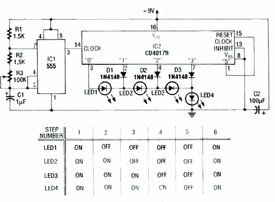 Este circuito tiene los efectos indicados en la tabla al lado del diagrama. Lo encontramos en la revista Radio Electronics de febrero de 1992. El circuito tiene su velocidad dependiente de C1 y ajustada en R3.
