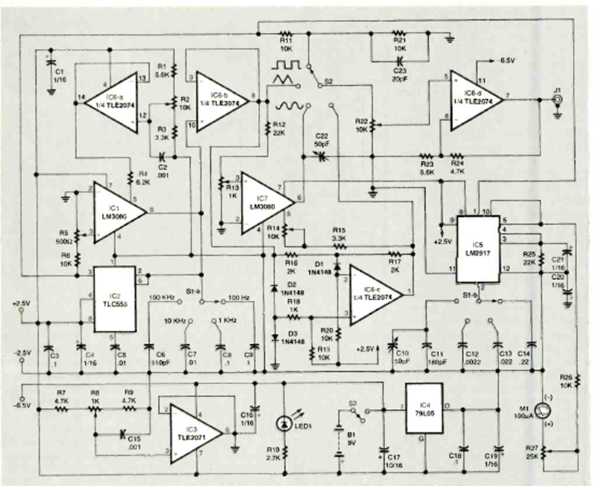 Este circuito fue encontrado en la revista Electronics Now de agosto de 1997. El circuito utiliza sistemas operativos conocidos y genera señales de hasta 20 kHz.