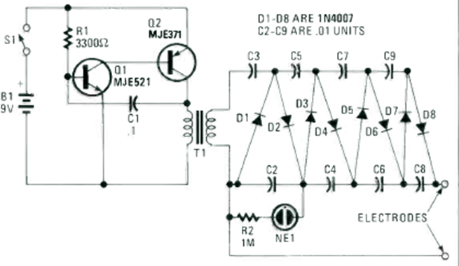 Esta defensa electrónica fue encontrada en el número especial de 1990 de la revista Radio Electronics Experimenter. Genera una tensión de unos pocos cientos de volts.