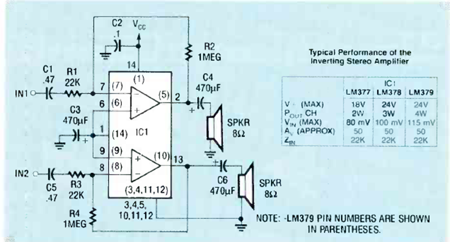 En la figura tenemos una aplicación del LM377 en un pequeño amplificador estéreo inversor con potencias de salida entre 3 y 4 W. El circuito es de unA Radio Electronics de abril de 1990.