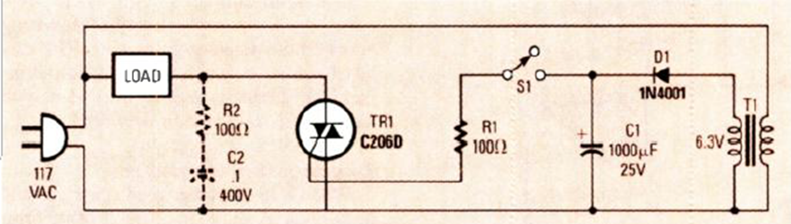 Este circuito de control que utiliza un interruptor de bajo voltaje se encontró en la edición de septiembre de 1987 de la revista Radio Electronics. El triac debe adaptarse a la carga y la tensión de la red eléctrica.