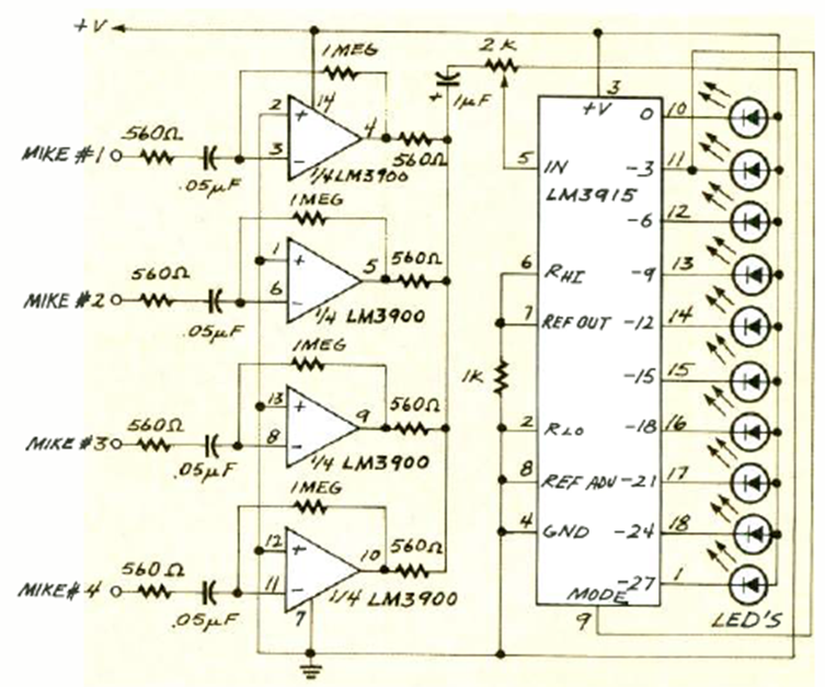 Este circuito para múltiples entradas de sonido fue encontrado en una Radio Electrónica de enero de 1992. Consiste en un Bargraph conectado a un mezclador multientrada.