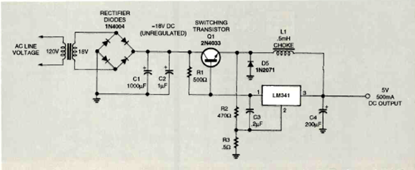 Este circuito de fuente de alimentación híbrido se encontró en la edición de agosto de 1997 de la revista Electronics Now. El transistor de potencia y el circuito integrado deben estar equipados con disipadores de calor.