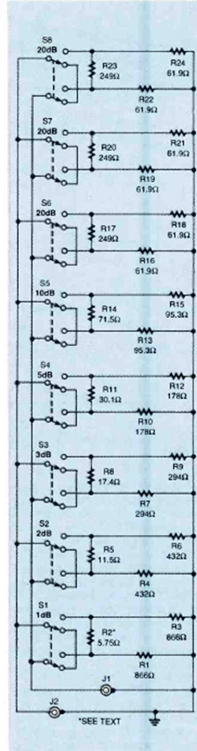 Este atenuador de señal fue sugerido por la revista Electronics Now de abril de 1999. El circuito es pasivo y se controla mediante interruptores manuales.