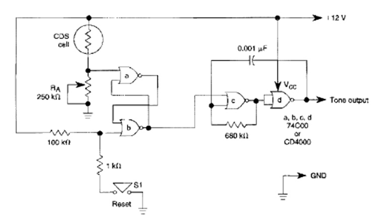 Esta alarma luminosa de enclavamiento se encontró en la Enciclopedia de Circuitos Electrónicos de 1995, Volumen 5. El circuito se alimenta con 12 V para proporcionar una señal a una etapa de potencia.