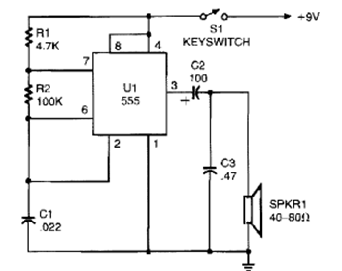 Encontrado en un Popular Electronics de la década de 1990, este circuito produce un tono en un pequeño altavoz. El manipulador controla directamente la fuente de alimentación.