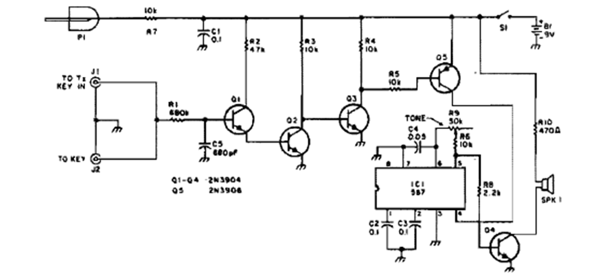 Este circuito de práctica de código se encontró en una edición de la década de 1990 de la revista Radio Amateur Today. Produce un tono de audio con el 555.
