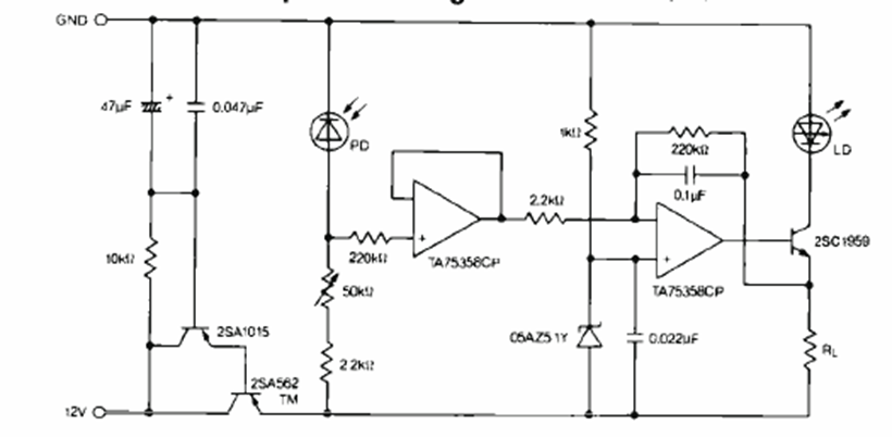Este es el circuito de nota de aplicación del circuito integrado utilizado con el diodo LÁSER. El circuito se obtuvo del Electronics Experimenter Handbook de 1992.