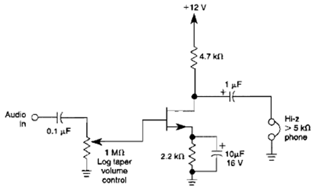 Este circuito de auriculares de alta impedancia se encontró en un William Sheets de la década de 1990. Su potencia es baja, pero su alta impedancia de entrada lo hace útil para aplicaciones de radio de galena.