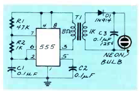 Este circuito consta de un pequeño inversor para encender una lámpara de neón con baja tensión. El circuito es de una revista Radio Electronics de octubre de 1989.