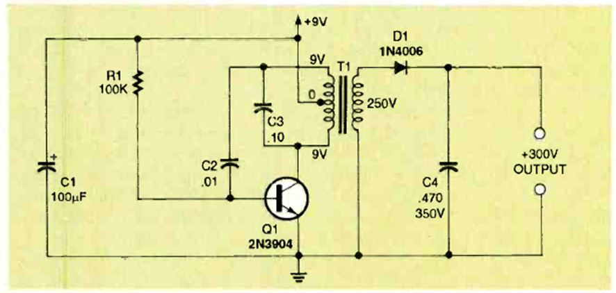 Por supuesto, la corriente es extremadamente pequeña, pero a partir de 9 V de una batería se puede obtener una tensión de 300 V. El circuito es de Electronics Now de mayo de 1994. C1 ajusta el punto de operación.