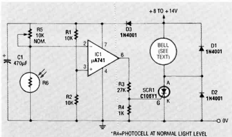 Este circuito se encontró en la edición de julio de 1992 de la revista Radio Electronics. Se basa en un 741 que activa un zumbador con un oscilador. R5 ajusta la sensibilidad.