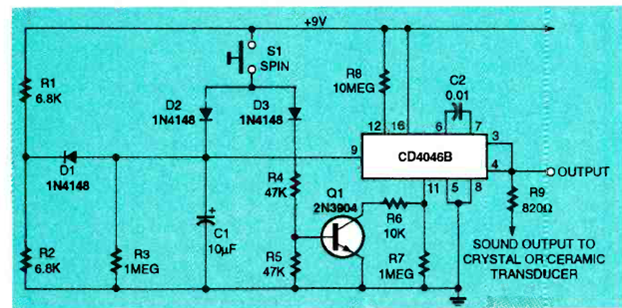 Este circuito utiliza un oscilador con el PLL4046 para excitar una cerámica piezoeléctrica. El circuito es de una revista Electronics Now de octubre de 1994.