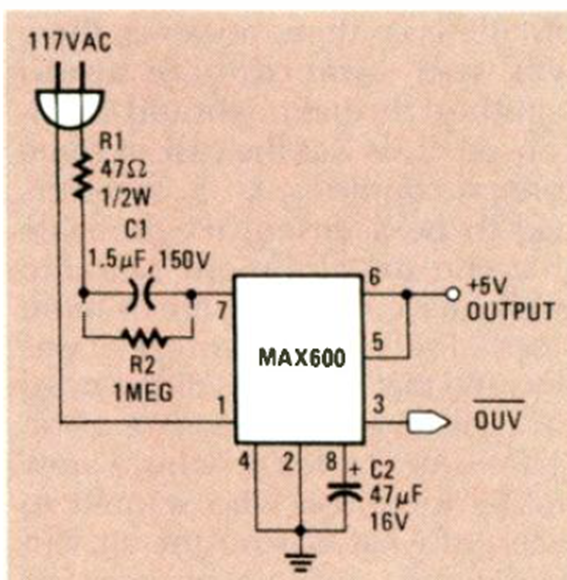 Este circuito para alimentar TTL e incluso microcontroladores modernos es de la revista Radio Electronics de febrero de 1987. Está basado en un circuito integrado de la época.