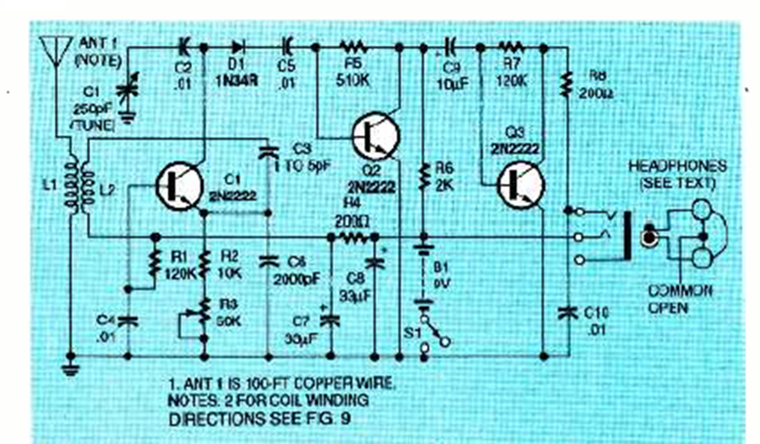 Este sensible circuito de tres transistores se encontró en la revista Electronics Now y es compatible con auriculares. El rango sintonizado depende de la bobina.