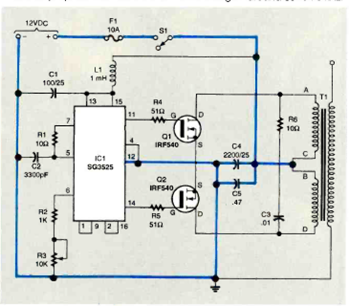 Este circuito fue encontrado en la edición de agosto de 1997 de la revista Electronics Now. Los FET deben estar equipados con disipadores de calor.