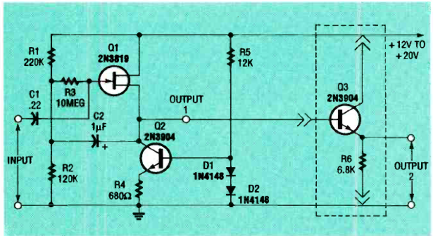 Este circuito se encontró en la edición de marzo de 1993 de la revista Electronics Now. Se trata de un seguidor de fuente con una impedancia muy alta que puede accionar una etapa bipolar.
