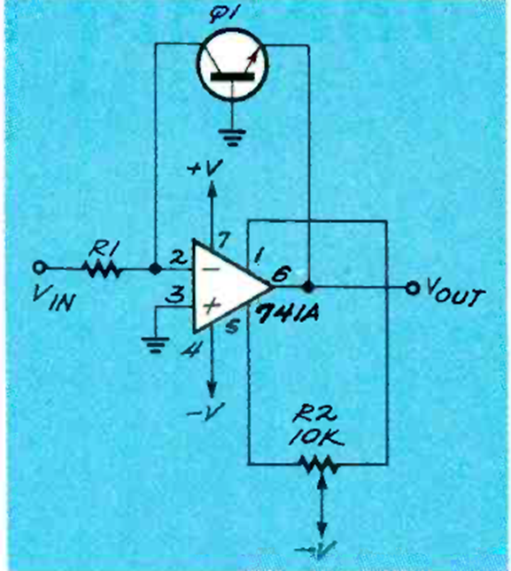 Este amplificador operacional logarítmico fue encontrado en la edición de septiembre de 1994 de la revista Electronics Now. El transistor puede ser de cualquier tipo de propósito general.