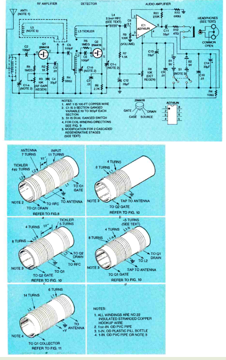 Este receptor fue encontrado en un artículo de la revista Electronics Now de marzo de 1994. Las bobinas son críticas, como se muestra en la figura. La escucha se realiza a través de auriculares.