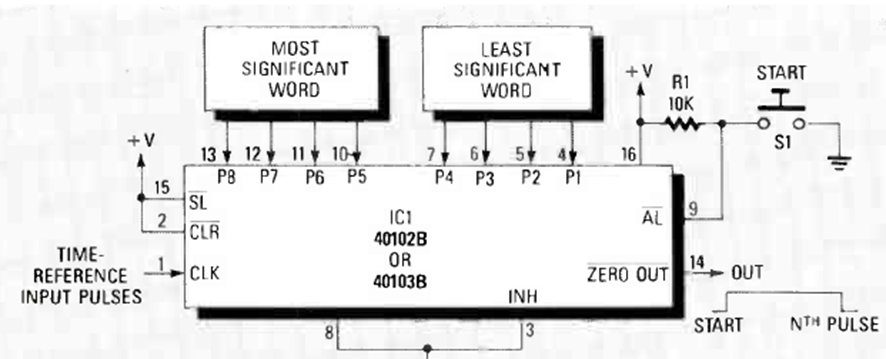 Este temporizador tiene un divisor programado mediante interruptores BCD. El circuito es de una revista Radio Electronics de febrero de 1989.