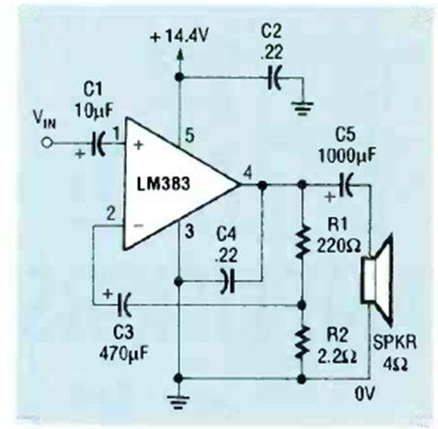 Este circuito para el automóvil se encontró en la edición de abril de 1990 de la revista Radio Electronics. El altavoz es de 4 ohms.