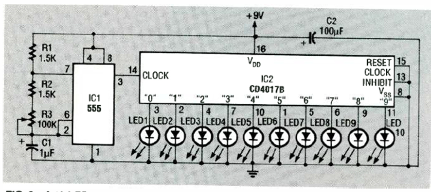 Este circuito secuenciador de LED tradicional se encontró en la revista Radio Electronics de febrero de 1992. La velocidad del efecto está dada por C1 y ajustada por R3. Se recomienda una resistencia reductora en serie con los LED.