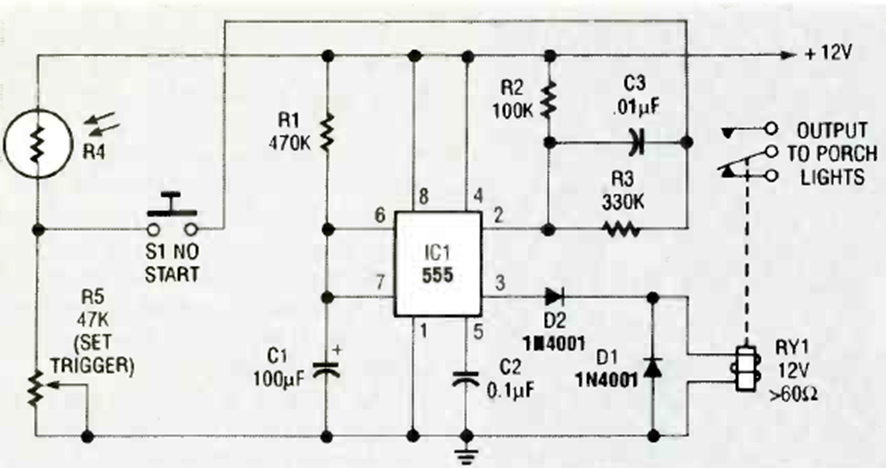 Cuando se corta la energía, este circuito mantiene la linterna encendida por un tiempo, lo que permite localizarla. El circuito es de una Radio Electronics de septiembre de 1992.