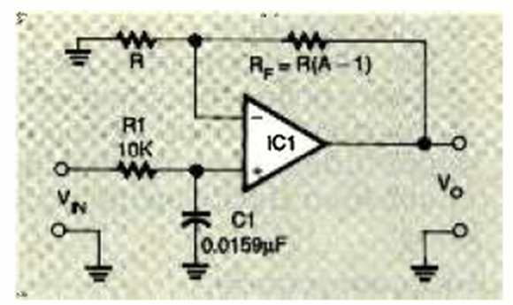 Este filtro de primer orden que se puede implementar con cualquier amplificador operacional fue encontrado en la revista Electronics Now de marzo de 1997. La fuente de alimentación debe ser simétrica.
