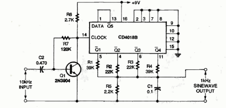 Este circuito CMOS digital genera señales sinusoidales a partir de una señal rectangular de 10 kHz. El circuito genera una señal de 1 kHz. Lo encontramos en la edición de enero de 1996 de la revista Electronics Now.