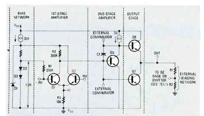 En la figura tenemos el circuito equivalente al preamplificador de audio IC LM381. El circuito fue encontrado en la edición de febrero de 1990 de la revista Radio Electronics.