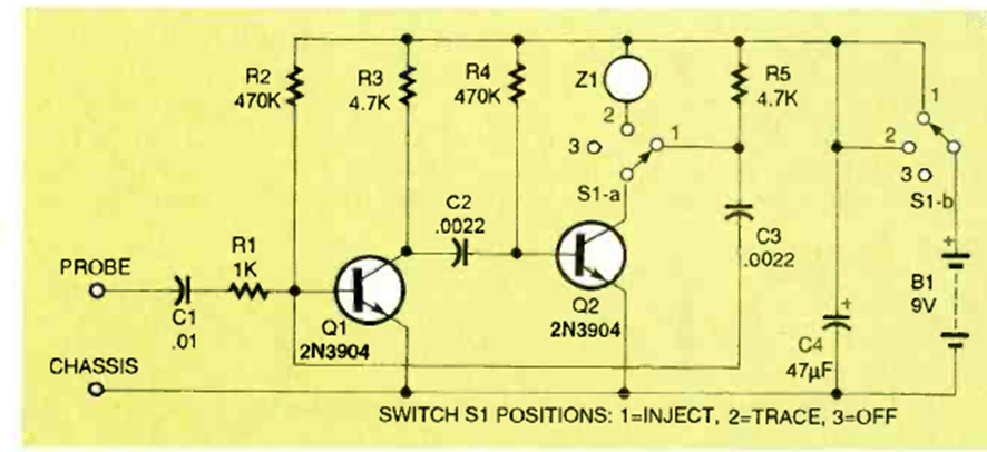 Este circuito funciona tanto como inyector como seguidor de señal. Lo encontramos en la revista Electronics Now de mayo de 1994. Se supone que los auriculares Z1 son de alta impedancia.