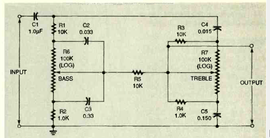 Encontramos este circuito pasivo en la revista Electronics Now de febrero de 1995. El circuito es pasivo, presentando únicamente atenuación que debe ser compensada por una etapa de amplificación.