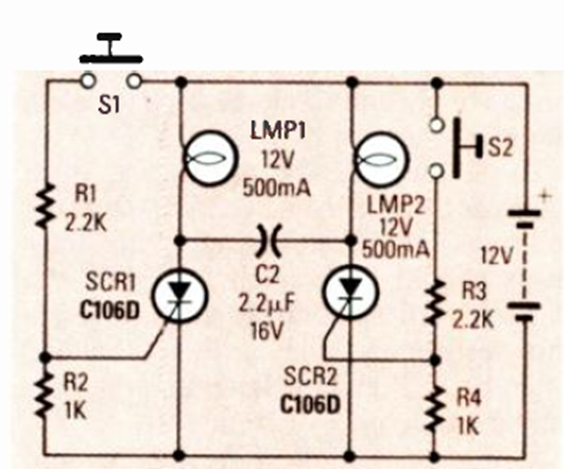 Esta versión biestable SCR es una de las muchas que tenemos en esta sección del sitio. Fue encontrado en la revista Radio Electronics de septiembre de 1987. Se utiliza para cargas resistivas.