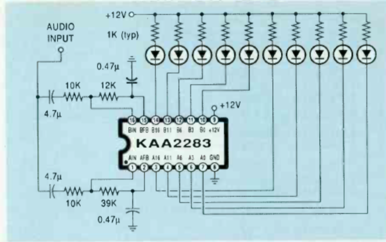 Este circuito mono para 10 LED se encontró en la revista Radio Electronics de enero de 1991. La fuente de alimentación es de 12 V.