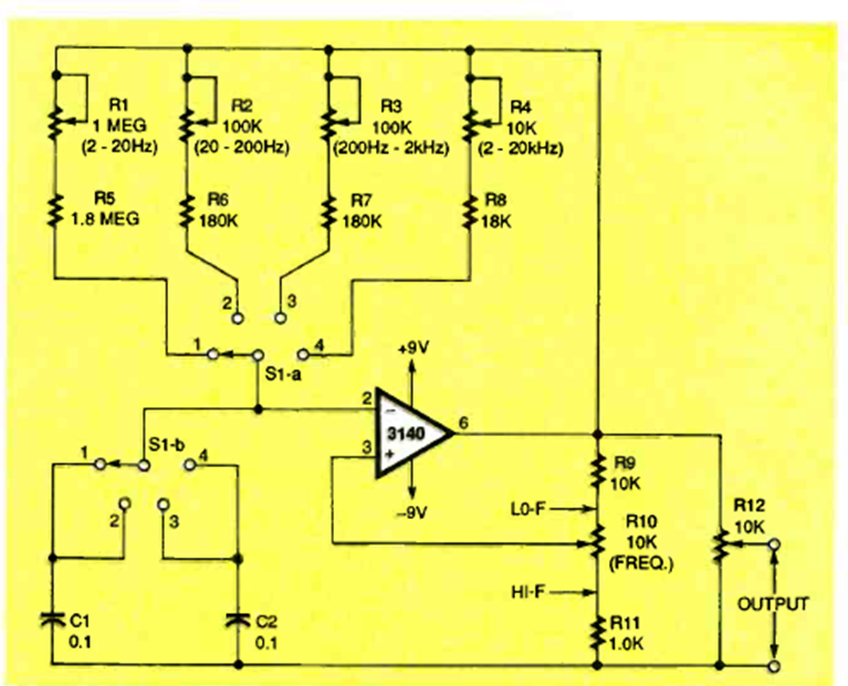 Este circuito genera señales en cuatro bandas de frecuencia con los valores límites indicados en el diagrama. El circuito fue encontrado en la edición de marzo de 1996 de la revista Electronics Now.