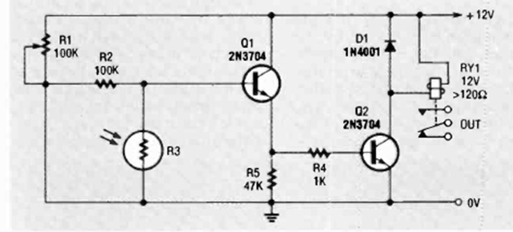 Este circuito sensible con transistores comunes se encontró en la revista Radio Electronics de julio de 1992. El relé se controla según la tensión de alimentación y la sensibilidad se ajusta mediante R1. La conexión entre R1 y tierra no existe (error original).